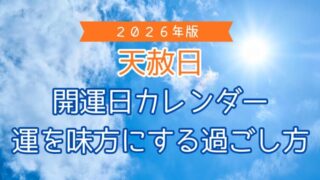 開運 【2026年】天赦日はいつ?開運日カレンダーと運気を味方にする過ごし方 2026年の天赦日はいつ?3月5日の最強開運日を含む全6回を解説。一粒万倍日や大安との重なりだけでなく、不成就日や三隣亡など「静かな開運日」の過ごし方もご提案します。心地よく一年を過ごしたい方へ。 2026.01.28 2026.02.01 開運